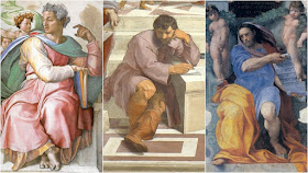 左:Michelangelo創世紀天頂畫中Isaiah的先知,中:雅典學院裡的Eraclito,